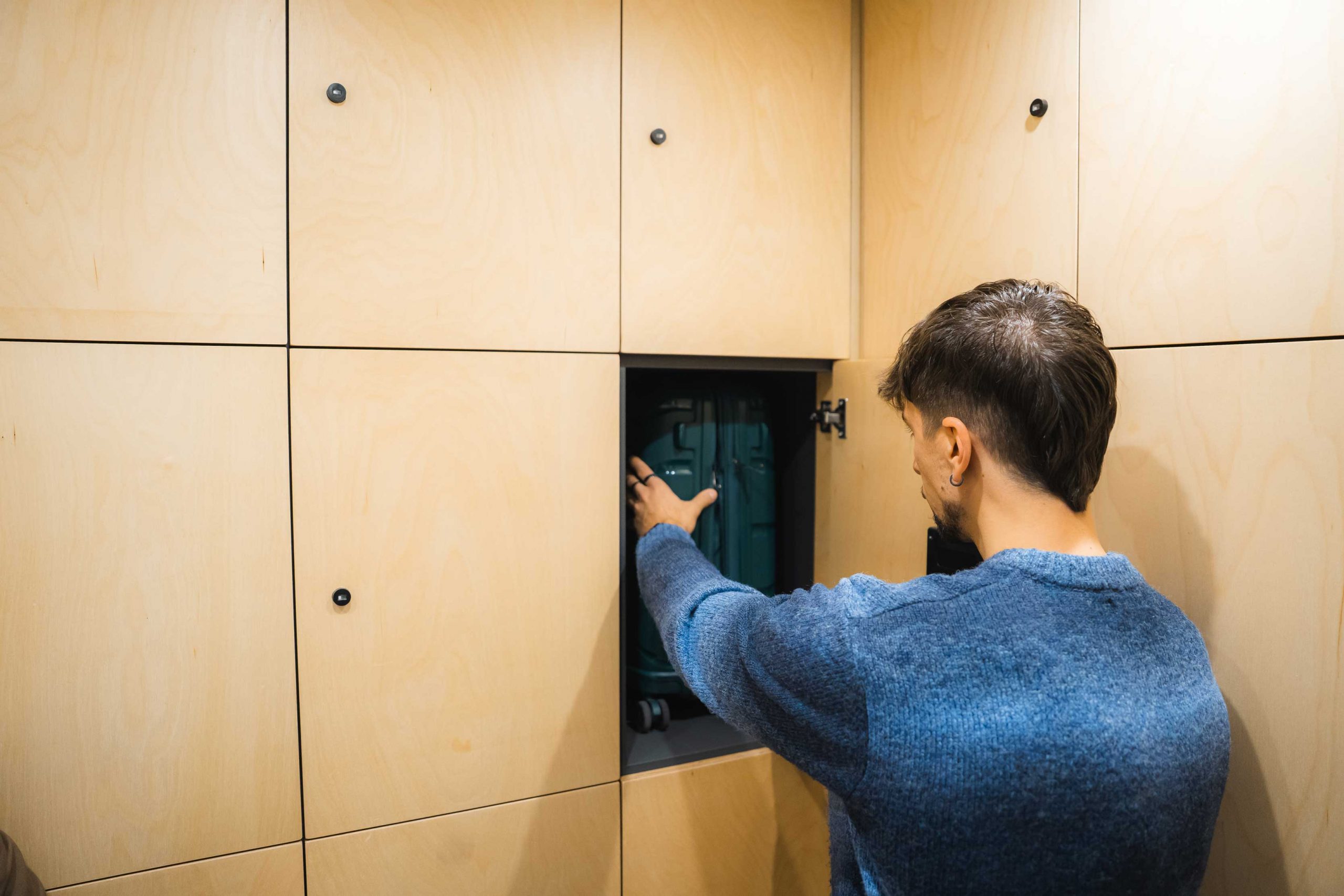 Usted puede elegir entre dejarlo en su cápsula si es un equipaje pequeño, en la taquilla que encontrará en su habitación, o en las taquillas de mayor tamaño que encontrará en la zona de recepción y la sala de estar.